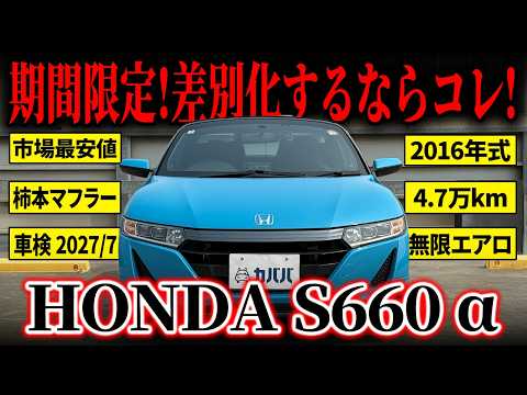 2016年式 ホンダ S660 αの登場です! 本車両は無限エアロや無限ホイールをはじめ、モデューロ車高調や柿本マフラーなどが装着された、非常に完成度の高いカスタム車両です。ホンダ系パーツで統一されている点も大きな魅力で、見た目・走りともにバランスの取れた仕上がりとなっています。 さらにコンディションの良さが感じられ、趣味性の高いセカンドカーとしてもおすすめできる一台です。 S660の中でもここまで仕上がった個体は多くないため、気になる方はぜひお早めにご検討ください!