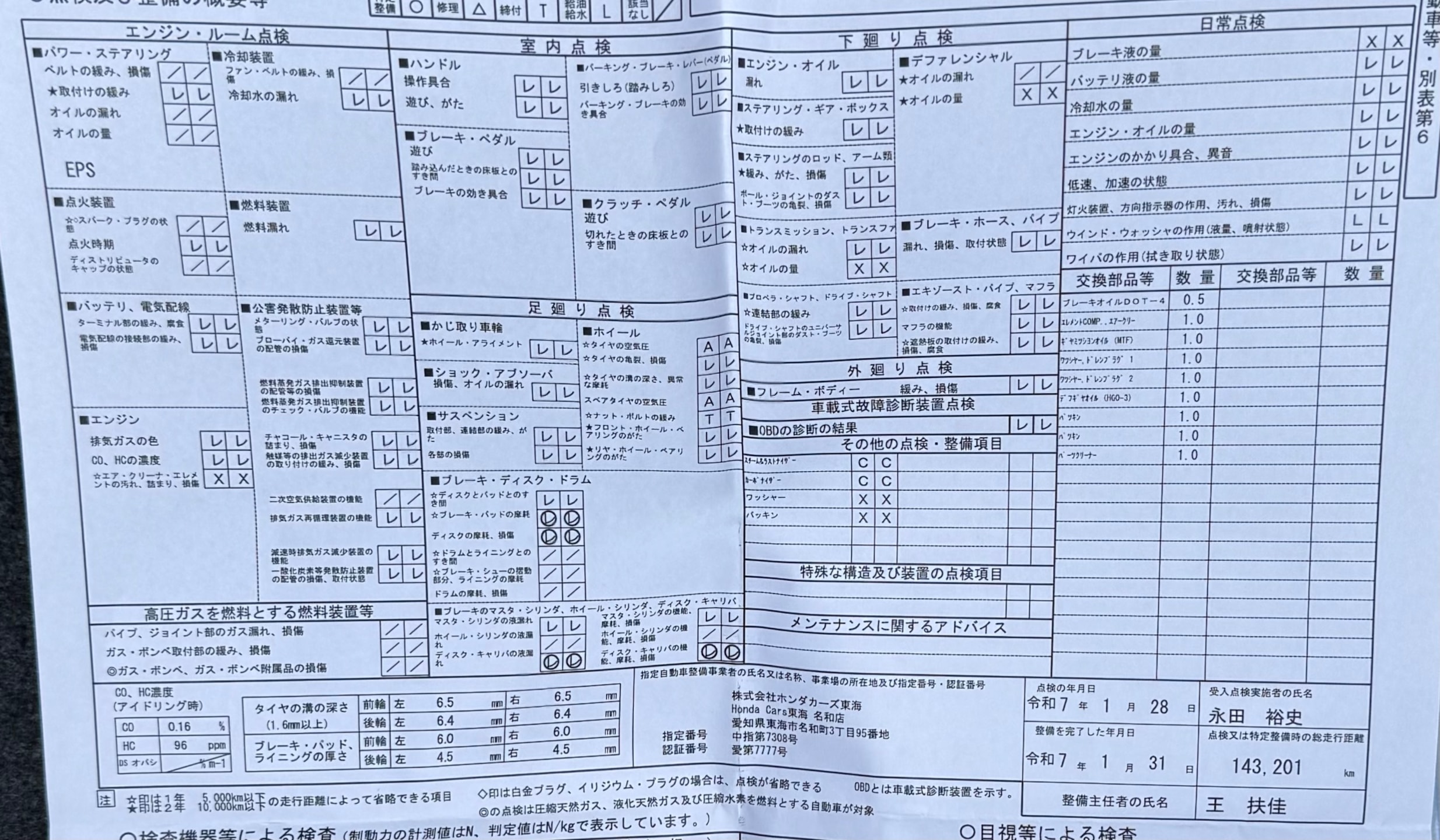 | エンジンオイルの状態 | R7/1 交換済み(143201km時) |
