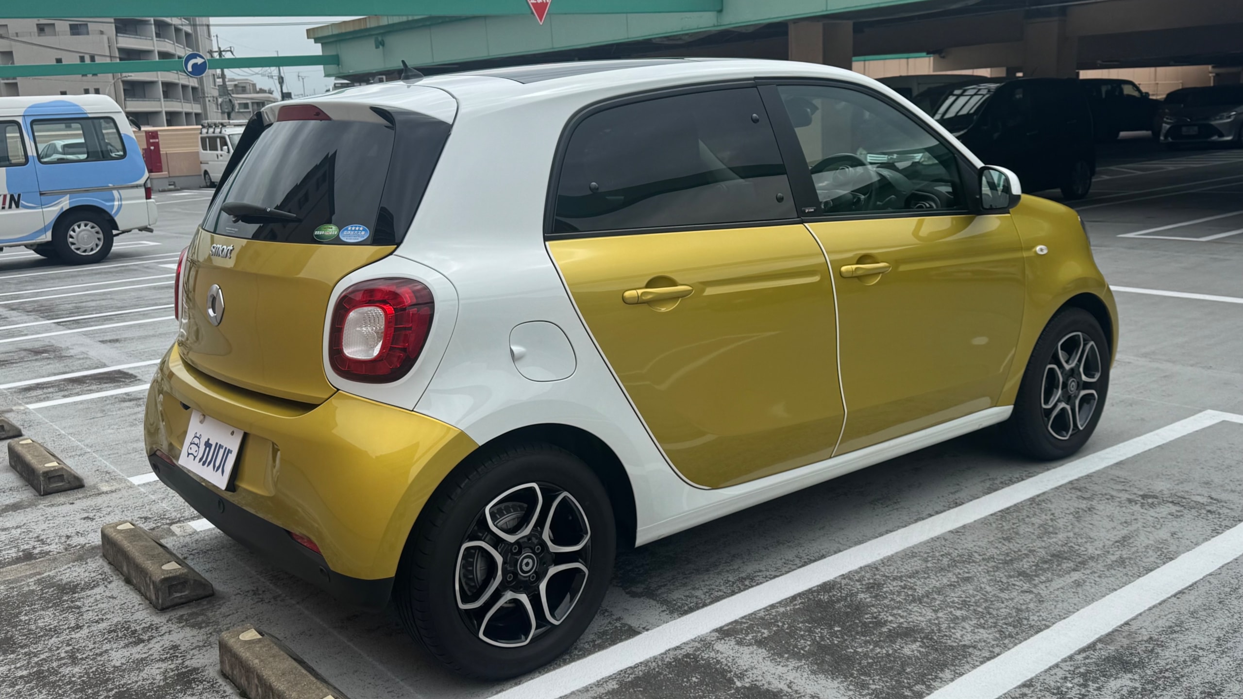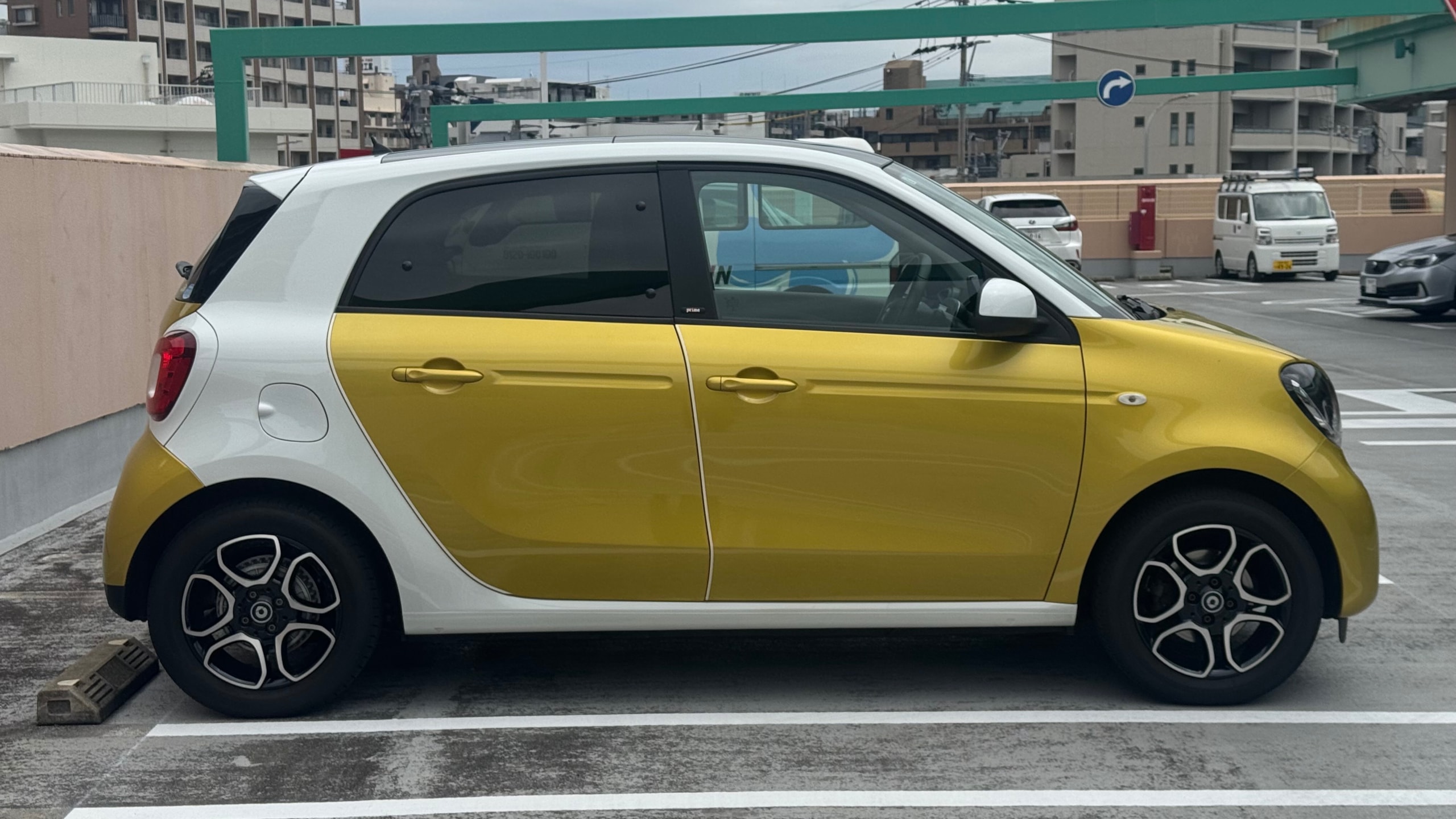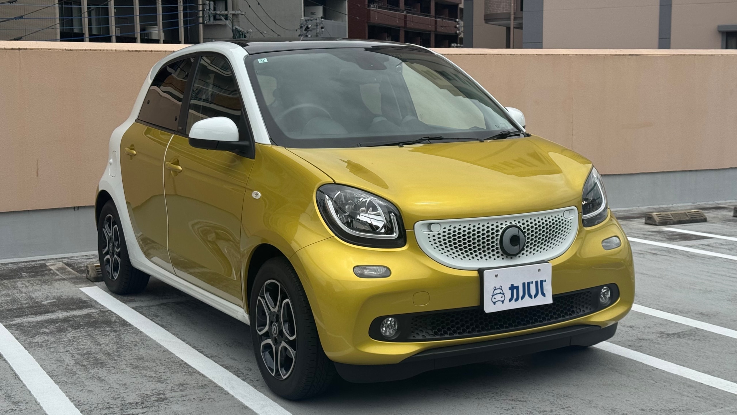【おすすめ装備】 ・イエロー×ホワイト ツートンカラー ・ガラスルーフ ・本革シート ・シートヒーター ・クルーズコントロール ・純正ナビゲーション ・バックカメラ ・パーキングセンサー ・オートエアコン 【カスタム・付属品】 ・Stradaナビ、TV ・バックカメラ内蔵型ルームミラー ・アンテナを短いタイプに変更(純正品もお渡しします) ・ドライブレコーダー ・ETC ※トランクの写真に写っているダンボールに純正パーツが入っております。 【本車両の魅力】 スマート フォーフォー プライム は、コンパクトなボディに個性的なデザインと実用性を兼ね備えた一台です。 最大の魅力はイエロー×ホワイトのツートンカラー。街中でも目を引くデザインで、他のコンパクトカーとは一線を画す存在感があります。 RRレイアウトならではの小回りの良さで、狭い道や駐車場でも扱いやすく、日常使いに非常に適したサイズ感。それでいて4ドア仕様のため、実用性もしっかり確保されています。 さらにガラスルーフや本革シート、シートヒーターといった快適装備も充実しており、“小さいけどしっかり上質”な一台に仕上がっています。 【メンテナンス】 ・禁煙車 ・ペット乗車歴なし ・週2回ほどの利用 ・立体駐車場の中で保管 ・メンテナンス R6/8/18 R4/9/7 タイヤ4本、バッテリー交換 R3/5/13 R2/5/13 R1/5/31 【車両状態】 ●外装 ・フロントガラス、バンパーに飛び石 ・左右リアフェンダーエッジ部に小傷 ・その他、薄い線傷などありますが全体的に綺麗な状態です。 ●内装 ・全体的に使用感薄く綺麗な状態です。 ・運転席ドア内張にスレ小